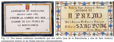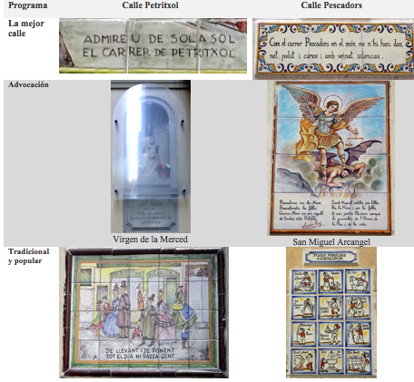 Dos estrategias de actuación: la placa o plafón (cerámicos, de metal, grafiados) y la capilla advocativa del santo o virgen protectora de la calle (volveremos a este tema en el apartado siguiente). En general las calles siguen un patrón de ornamentación bastante similar. El inicio es decir a los cuatro vientos que como esta calle no hay otra en el mundo. Sigue la advocación y luego de un modo u otro se vincula la calle con lo popular y tradicional, se identifica la diferencia y se ponen de relieve algunos hechos importantes generalmente mediante las figuras de personalidades locales que han residido en la calle a lo largo de su historia. Lo vemos comparando la calle Petritxol (burguesa y en el centro histórico) y la calle Pescadors en el popular barrio de La Barceloneta.