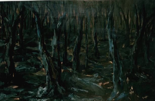 El bosque negro lo forman árboles oscuros, negros, grises, desgarrados por la soledad y la tristeza, por la falta de libertad que nos producen nuestras propias limitaciones. Con fondo muy gris, están inundados. El que destaca, especialmente por su color rojo, determina las luces y sombras del bosque como en el espíritu humano siempre está la esperanza de que alguien o algo nos libere de las ataduras, que no somos capaces de romper, este es el árbol rojo, que sin ser diferente en su principio se transforma en árbol rojo de fuego para abrirnos una ventana a la esperanza.