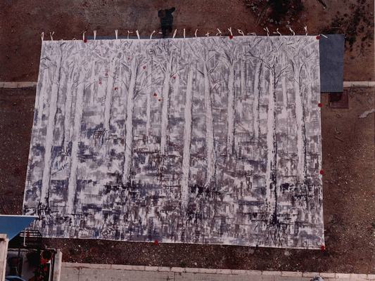 Pasando al tema, he de mencionar en primer lugar la referencia, que se hace a “otro”, entre comillas, porque parte e incluye la propia polisemia del Arte, medio o lugar, que tiene el artista para expresarse. En el caso que nos ocupa, son dos lienzos, de 70 metros cuadrados cada uno, donde Dolores Balsalobre plasma “otras” naturalezas: blanca y negra. De forma paralela la pintora entra en ellas como “lector-visualizador”, lo que le acerca a esas otras proyecciones artísticas, que no están en un entorno cotidiano, ni tampoco en los museos. Las fotografías[8] muestran, la instalación de los lienzos, que, como se ve en las imágenes, son parte de la tierra, del paisaje, que los rodea, e igualmente a la pintora de pie fuera del bosque blanco, con los pies en la tierra y participando de la sensación y conjunción con la naturaleza real y la creada.