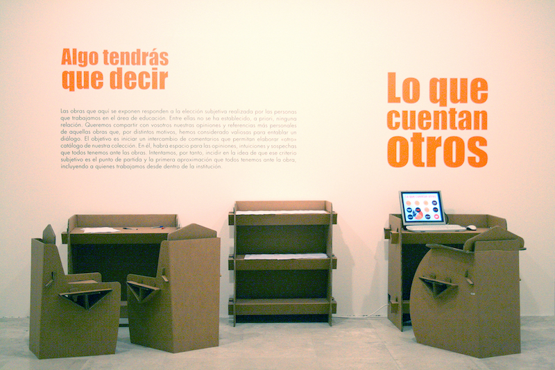 Un año después se inauguró la exposición Algo tendrás que decir (Imagen 2), una propuesta que invitaba a los visitantes a dialogar con las obras expuestas. La primera fase de esta iniciativa se elaboró a partir de la selección, por parte de los miembros del equipo de educación, de un conjunto de piezas de la colección del museo. El criterio utilizado por estos respondía únicamente a una cuestión subjetiva. Las obras se acompañaban de frases y textos situados en los muros de la sala, ofreciendo así las opiniones subjetivas de las personas que habían participado en la selección de las piezas, convirtiendo este dispositivo textual en una especie de catálogo razonado de la muestra. El montaje ofrecía al público visitante la posibilidad de seleccionar alguna de las obras expuestas, y justificar su elección mediante la elaboración de una frase o un texto breve, ofreciendo su interpretación de la obra. La segunda fase de la exposición consistió en la sustitución de los textos elaborados por los educadores por aquellos producidos por los visitantes. Este ejercicio supuso la ruptura de las jerarquías de conocimiento que exhiben habitualmente los museos, dando voz a los usuarios de los museos que tradicionalmente han estado silenciados.