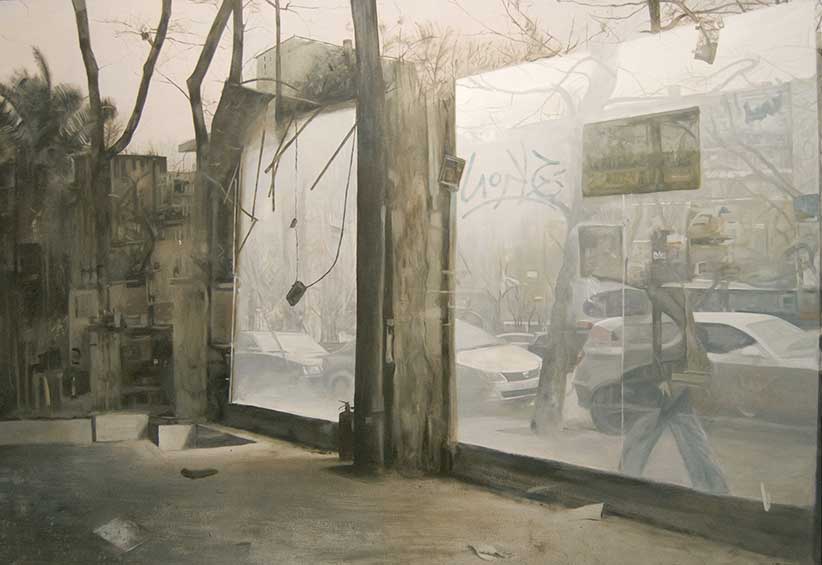 De otro lado, una segunda mirada, del mundo exterior, que contempla la ciudad como lugar de convivencia, de relación con los demás, de entropía, de confusión, separado del mundo interior con filtros de protección y de defensa, mediante esos escaparates que marcan la barrera entre el mundo interior respecto del mundo exterior. Un mundo exterior mediatizado por la mochila que todos portamos y que plásticamente se traduce en ese vidrio lleno de reflejos, no transparente, traslucido, que impide ver la realidad tal cual es y nos la hace ver matizada y sesgada.
