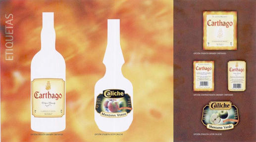 | Figura 3.Diferentes opciones de etiqueta, para Brandy Carthago y Licor Caliche, rediseñadas para la empresa por HUMANA. |