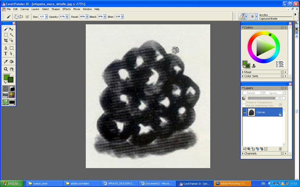 | Figura 4.Detalle proceso de realización de dibujo para etiqueta. Programa Corel Painter IX. (2006) |
