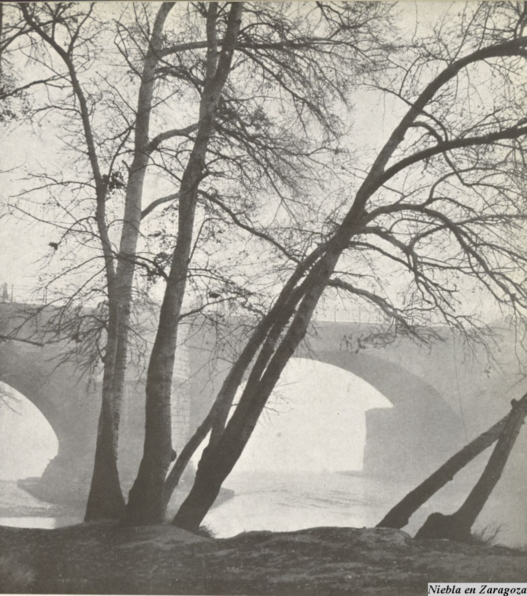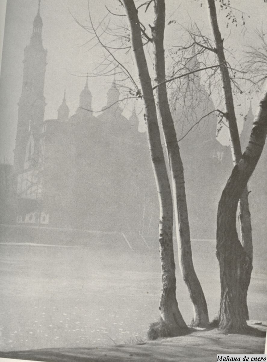 Siguió en marzo, con Mañana de enero (fig. 2), de Sebastián Gómez Cortés, medalla de plata en el V Concurso Nacional de Fotografía Artística del Foto-Club de Valencia. En la mejor y más característica vertiente pictorialista, tomando como base algunos trabajos de los “postaleros” zaragozanos. En efecto, la Basílica del Pilar, reproducida por enésima vez, sirve de fondo con su cúpula mayor y una de las torres. La foto está tomada desde la orilla izquierda, con el inevitable efecto atmosférico de la niebla y cuatro árboles enmarcando la composición en primer plano. Lo entendemos al reproducir sus palabras: