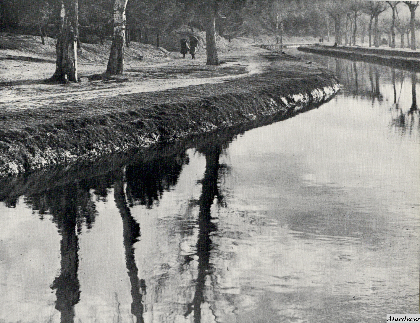 El prestigio –unido a su frenética actividad y dinamismo en estos años- de la veterana Sociedad es continuamente reconocido, aparte de estos premios, en la inclusión de obras de sus integrantes en las páginas de la revista Arte Fotográfico, la más seguida en el Estado español. Esto permitía dar a conocer a nombres que, de otra manera, hubieran quedado limitados al ámbito local. Es el caso del propio Manuel Serrano Sancho, del que insertan su Atardecer (fig. 4) en su sección fija de imágenes. Una vista del Canal Imperial de Aragón, con la proyección de la perspectiva en ese, en curva, donde dos personajes situados a la izquierda del cuadro dan medida de la escala, y los árboles de la ribera se reflejan en las aguas. La siguiente era de Ignacio María de Urrecha, Niebla en Zaragoza (fig. 5). Una vez más, el río Ebro y el Puente de Piedra como protagonistas de la composición, con el efecto atmosférico de rigor y los árboles en primer término para definir la escala de planos. En el número de mayo de 1952, aparece la fotografía Fuente de Casablanca (fig. 6), de Sebastián Gómez Cortés. Toma como motivo la denominada Fuente de los Incrédulos de ese barrio zaragozano, donde dos personas beben agua de la misma. Contiene todas las características típicas del tardopictorialismo: un motivo arquitectónico, la fuente, de resabios clasicistas para más señas, con personas que actúan de mera figuración anónima (no es una fotografía humanista), supeditadas a la visión general y de conjunto. Todo inmerso como en una impenetrable aura de intemporalidad: la foto podría pasar perfectamente por ser del siglo XIX.