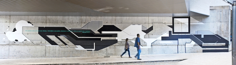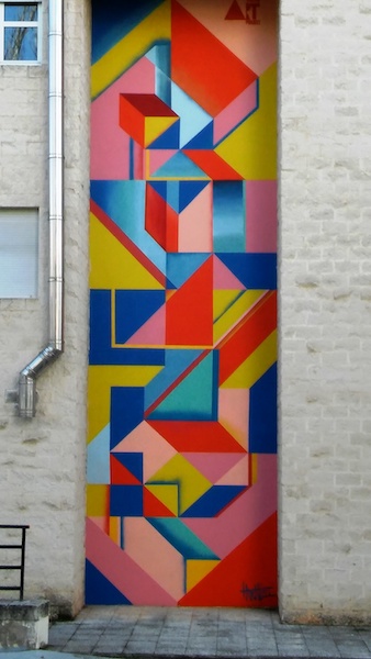Anna Taratiel (Tarrasa, 1982) comenzó realizando graffitis en Barcelona con el nombre artístico de Ovni. Ha realizado proyectos para exponer en sala, escultura e instalación y ha colaborado en proyectos multimedia y videojuegos. Para Teruel realizó con los estudiantes dos grandes obras murales (de 10,6 x 2,5 m. cada una), situadas en el edificio antiguo de la Facultad de Ciencias Sociales y Humanas. En palabras de la autora “las obras están parcialmente inspiradas en el mudéjar turolense, en sus formas geométricas”. Esto conecta perfectamente con su estilo que tiene como fuente de inspiración al constructivismo ruso.