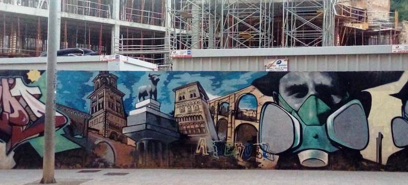 El lugar en el que se ubicaron estos graffitis fue bajo los dos viaductos de Teruel, sobre la valla de 50 metros de largo por 2 m. de altura, que rodeaba el antiguo asilo de San Julián. El Ayuntamiento no permitió pintar directamente sobre el muro y colocó para la ocasión unos paneles de madera, que han soportado muy mal el paso del tiempo. En la actualidad las obras ganadoras han desaparecido y el resto se encuentra en muy mal estado de conservación. En este mismo momento se realizaron dos obrasfuera de concurso, por alumnos de la titulación de Bellas Artes [Luis Manuel Ramos Luna (alias Eleman) y Andrés Lecuona (alias Soer)]. Estas se pintaron directamente sobre el muro, por lo que han soportado mucho mejor el paso del tiempo que las obras que participaron en el concurso. En uno de los murales podemos ver una composición con la caricatura del futbolista Pelé y una tipografía al estilo Hip-Hop obra de Eleman (de 2 x 2 m.). El otro, es una obra colectiva realizada por: Eleman, José María Cerón (alías Set) y Soer. Lleva por título ARTERUEL (1,70 / 2 x 15 m.) y en ella vemos una representación realista, a modo de collage, donde se representan algunos de los elementos arquitectónicos más destacados de la ciudad (la torre mudéjar de San Pedro, el acueducto de Pierres Vedel, el torico, la torre de la catedral etc.), con un pequeño texto con tipografía de estilo Hip-Hop. En la escena se incorporan unos retratos de dos guardias civiles, que aportan a la obra un toque irónico, ya que aparecen protegidos con máscaras antigás (dando la impresión de haber algún tipo de contaminación medio ambiental en el entorno). Aunque se encuentra en buen estado de conservación, parece que corre peligro de derribo debido al inicio de las obras del futuro conservatorio y esta tapia desaparecerá.