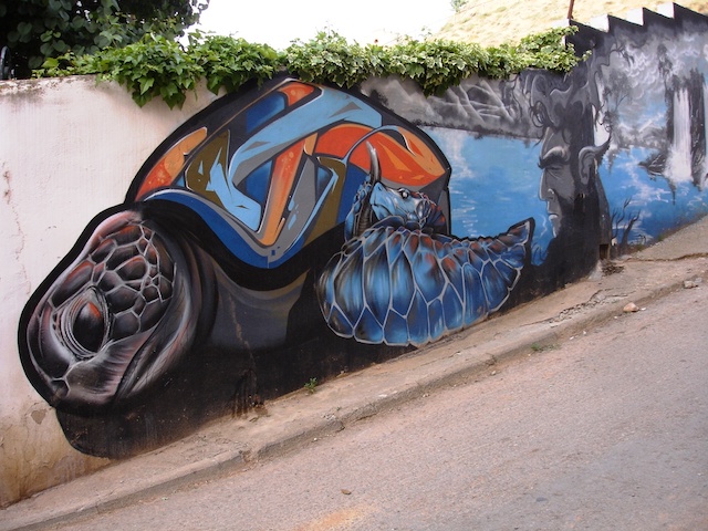 8. Una tortuga en Teruel, 2011. David Reñe, Luis Manuel Ramos y Andrés Lecuona (2 x 11 m., desaparecida). Obra para el II Concurso de Arte Urbano de San Julián. C/ Eras de San Julián 2. F.: José Prieto, 2012. |