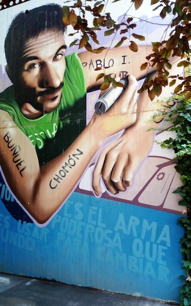 Esta obra de carácter realista en la que su autor hace un retrato de Hugo Casanova, con nombres de cineastas aragoneses, de políticos y lingüistas rotulados en sus brazos. Y con la inscripción, en la parte inferior del mural, de una frase de Nelson Mandela, sobre la importancia de la educación: “La educación es el arma más poderosa que puedes usar para cambiar el mundo”.