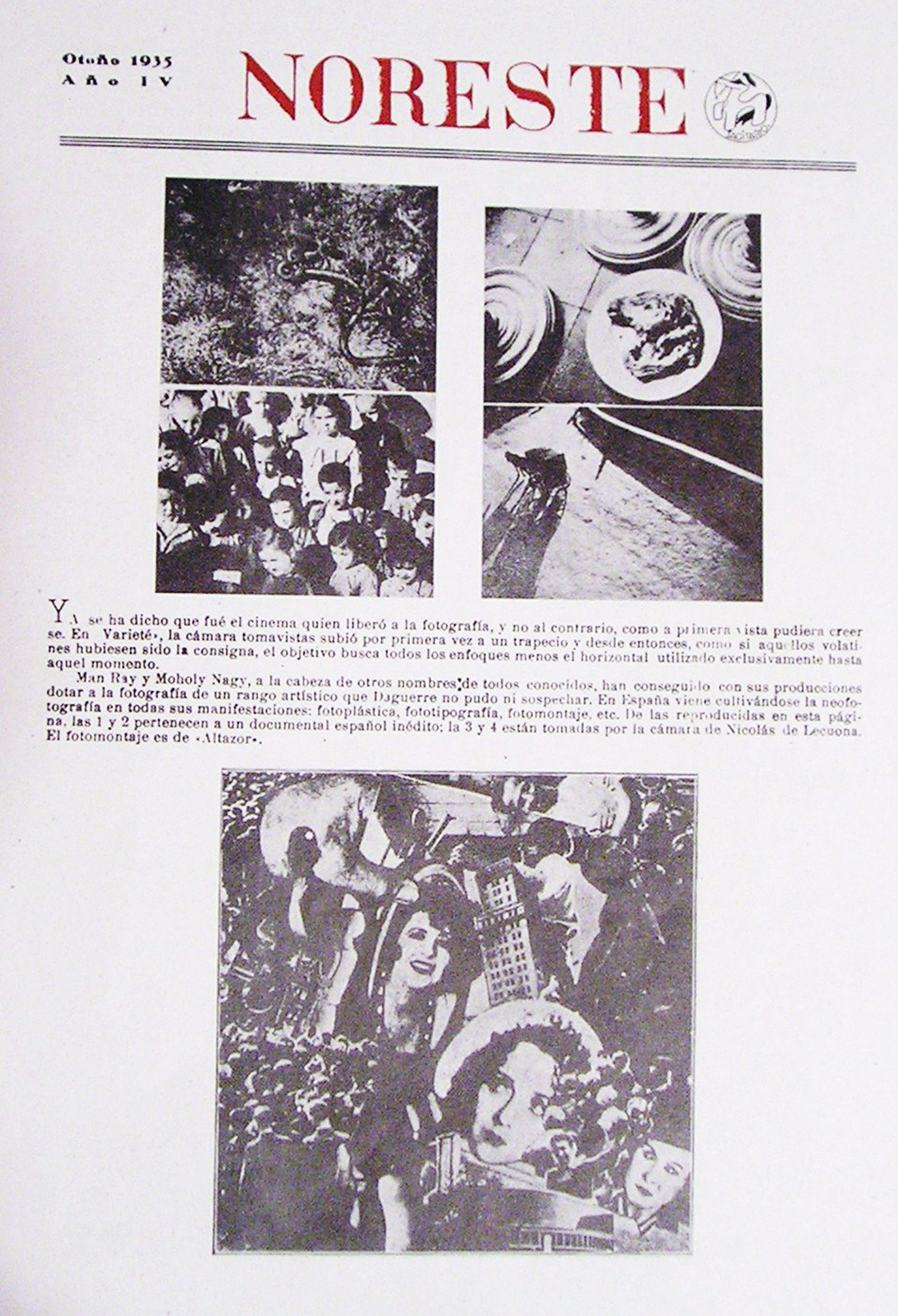 Ésta es la página más importante para conocer la dimensión de la aportación de Tomás Seral y Casas al arte contemporáneo aragonés. En ella dos párrafos escuetos aportan datos muy interesantes acerca de las nuevas prácticas fotográficas. Tras desmentir que la fotografía antecede al cine y afirmar que éste ha sido el que ha liberado la rigidez frontal del objetivo, nombra en primer lugar las posibilidades de los picados, contrapicados y cámaras tomavistas con las que trabajó Alexander Rodchenko en la URSS. Esta afirmación fue ilustrada con dos ejemplos de quien ya publicó en entregas anteriores de Noreste y mantuvo amistad con Alfonso Buñuel (A. Moya, 1992: 74) antes de morir durante la contienda civil: el vizcaíno Nicolás de Lekuona. Estas dos fotografías son comparadas con dos fotogramas de la última película de Luis Buñuel Tierra sin pan. Las Hurdes, siendo en una de ellas evidente la influencia de la fotogenia de Jean Epstein, al tratarse de un plano detalle de un objeto en picado (Jean Epstein define el primer plano y la fotogenia como valores esenciales del cine frente a lo pictórico, en J. Epstein, Bonjour Cinéma, Paris, Éd. De la Sirene, 1921, recogido en J. Epstein, 1974: 93-95. Acerca de la influencia de Epstein en el cine de Buñuel, consultar A. Monegal, 1993: 34-36; y Ribler-Pipka, 2004: 204-214). La quinta imagen la constituye el mismo fotomontaje que ilustra la portada de Mascando goma de estrellas. Con él Seral y Casas se refiere en el segundo párrafo a las renovaciones técnicas fotográficas llevadas a cabo por Man Ray y Moholy-Nagy, afirmando haber tenido sus repercusiones en España, lo que le permite proponerse él mismo como ejemplo de esta afirmación bajo el pseudónimo “Altazor” y junto con Nicolás de Lekuona, aludiendo concretamente a la fotoplástica teorizada por Moholy-Nagy en 1925, al fotomontaje y la fototipia, es decir, la unión de la fotografía y la composición fotográfica en el diseño gráfico, aunque no cite explícitamente el rayograma de Man Ray ni el fotograma del artista húngaro.