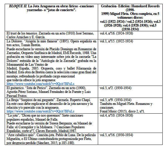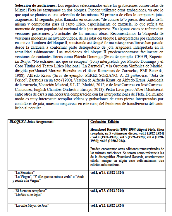 La presente propuesta plantea el estudio de diversas cuestiones relacionadas con la jota y otros contenidos musicales esenciales en el Grado en Magisterio a través de audiciones históricas y contemporáneas de jota y zarzuela vinculadas a Miguel Fleta. Éstas se relacionan a su vez con otros intérpretes y/o versiones que enriquecen la experiencia auditiva y propician el aprendizaje de una gran variedad de elementos. Así pues, partiendo de grabaciones realizadas por Fleta se propone un modelo de ficha de análisis de audición que permite esbozar a través de diversos bloques conceptuales, los elementos musicales más importantes enriquecidos por otros contextuales.