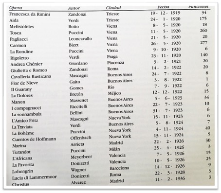 Figura 3 – Repertorio interpretado por M. Fleta. Relación de las mismas, lugar y fecha de sus primeras actuaciones (Solsona, 1998c, p. 77)