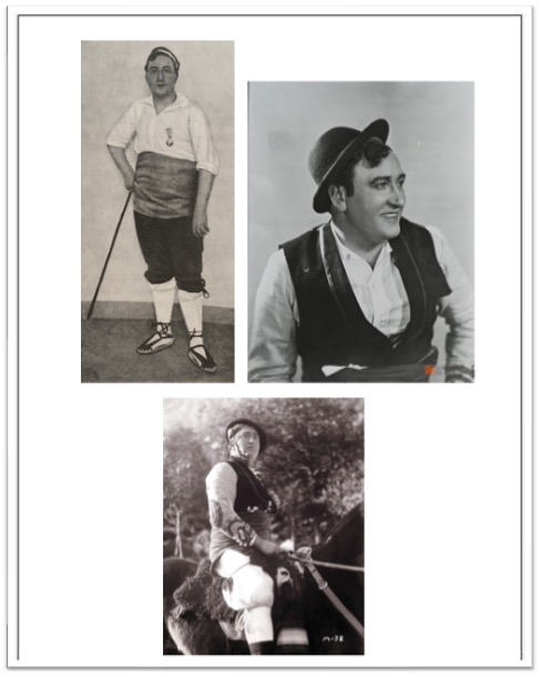Figura 4- Retratos de Miguel Fleta con indumentaria tradicional aragonesa. Imágenes de Miguel Fleta, en primer término, ataviado con el traje de jotero, posando con la medalla de Alfonso XII (Solsona, 1998a: 12). En las otras dos, fotografiado con sombrero y traje típico ansotano (Ansó, Huesca) retrato (realizado en el estudio de A.M. Coyne en 1933. Archivo Histórico Provincial de Zaragoza- Retratos modernos, Cod. ES/AHPZ – MF/COYNE/007631.) y sobre un caballo, vestuario de la película Miguelón o El Último Contrabandista, dirigida por Adolfo Aznar en 1933 (Sánchez, 2015: 185-188).