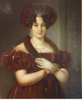 El recorrido por las diferentes estancias del Museo del Romanticismo en Madrid nos acerca a tres de los retratos más reproducidos del pintor oscense que han aparecido habitualmente en los escasos estudios sobre Valentín Carderera como pintor[5]. En la sala I, el vestíbulo, en la que se sintetizan algunas de las novedades y características de la casa isabelina, encontramos el citado retrato de la reina gobernadora, María Cristina, del que el catálogo nos advierte está representada con capa de armiño y "luciendo el 'primer aderezo' que el rey le regaló con motivo de su enlace, formado con piedras preciosas que había pertenecido a la madre del monarca". Se trata sin duda del cuadro que en la lista de Carderera aparece con el número 342.