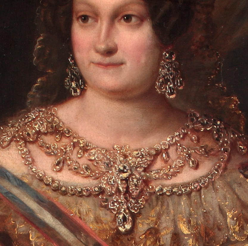 Por su parte en la segunda de las piezas indica que "está representada en pie y en tamaño mitad del natural. Tiene en el peinado ave del paraíso, muy ancha diadema y peine, todo de gruesos diamantes, así como los pendientes de tres caidas, compañeros del magnífico collar de las mariposas[3], de las que penden además grandes chatones en ondas. Lleva la Reina vestido de gasa blanca y oro con muy espaciosa guarnición de encaje con claveles y rosetas de oro. En la mano derecha tiene el abanico. El manto es encarnado con bordados de oro".